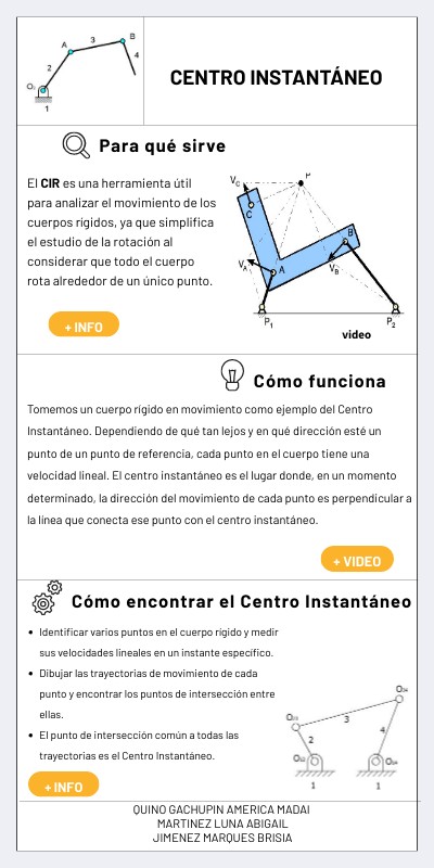 Tomemos un cuerpo rígido en movimiento como ejemplo del Centro Instantáneo. Dependiendo de qué tan lejos y en qué dirección esté un punto de un punto de referencia, cada punto en el cuerpo tiene una velocidad lineal. El centro instantáneo es el lugar donde, en un momento determinado, la dirección del movimiento de cada punto es perpendicular a la línea que conecta ese punto con el centro instantáneo.