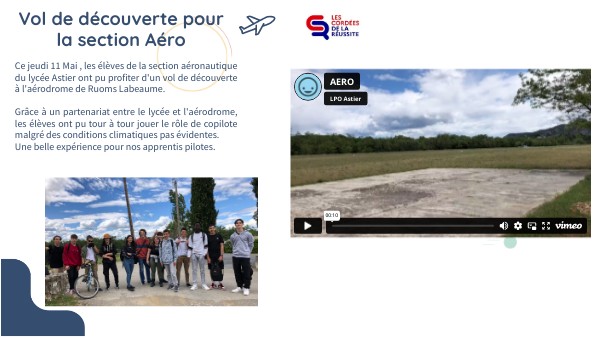 Ce jeudi 11 Mai , les élèves de la section aéronautique du lycée Astier ont pu profiter d'un vol de découverte à l'aérodrome de Ruoms Labeaume. Grâce à un partenariat entre le lycée et l'aérodrome, les élèves ont pu tour à tour jouer le rôle de copilote malgré des conditions climatiques pas évidentes. Une belle expérience pour nos apprentis pilotes.