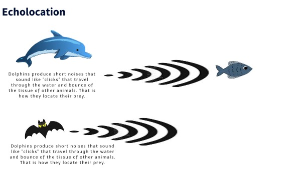Dolphins produce short noises that sound like "clicks" that travel through the water and bounce of the tissue of other animals. That is how they locate their prey. A sonar wave is a sound wave that can travel under water, these are the sound waves that animals such as whales and dolphins use.