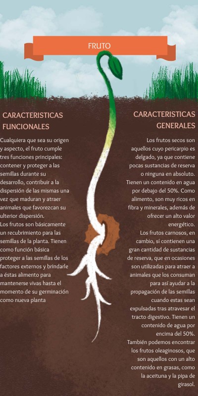 Cualquiera que sea su origen y aspecto, el fruto cumple tres funciones principales: contener y proteger a las semillas durante su desarrollo, contribuir a la dispersión de las mismas una vez que maduran y atraer animales que favorezcan su ulterior dispersión.Los frutos son básicamente un recubrimiento para las semillas de la planta. Tienen como función básica proteger a las semillas de los factores externos y brindarle a éstas alimento para mantenerse vivas hasta el momento de su germinación como nueva planta