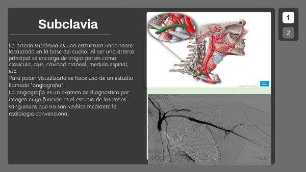 La arteria subclavia es una estructura importante localizada en la base del cuello. Al ser una arteria principal se encarga de irrigar partes como: clavicula, axis, cavidad craneal, medula espinal, etc.