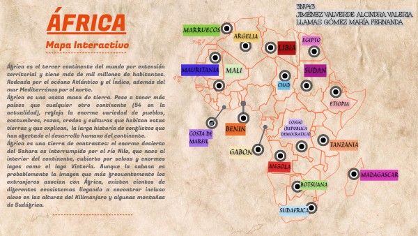 África es el tercer continente del mundo por extensión territorial y tiene más de mil millones de habitantes. Rodeada por el océano Atlántico y el Índico, además del mar Mediterráneo por el norte.África es una vasta masa de tierra. Pese a tener más países que cualquier otro continente (54 en la actualidad), refleja la enorme variedad de pueblos, costumbres, razas, credos y culturas que habitan estas tierras y que explican, la larga historia de conflictos que han afectado el desarrollo humano del continente.