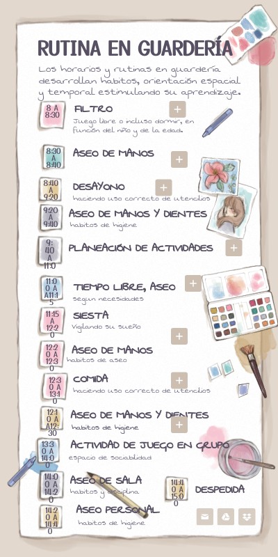 Los horarios y rutinas en guardería desarrollan habitos, orientación espacial y temporal estimulando su aprendizaje.