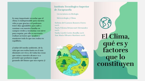 Es muy importante recordar que el clima es indispensable para nuestra vida ya que gracias a el podemos tener días agradables para salir a caminar con nuestra familia en campos verdes y montañas con nieve para esquiar, por ello es necesario realizar acciones que ayuden a mantener todo lo que nos rodea en equilibrio. ¡Cuidar del medio ambiente, de la vida que nos rodea hasta en el más diminuto ser vivo y de todas las cosas que estan a nuestro alcance va a permitir que podamos seguir gozando del futuro que nos espera :)!