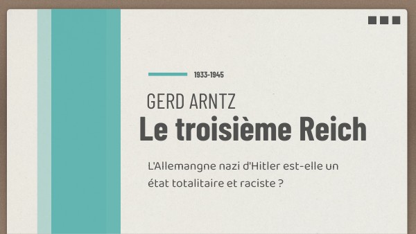 Le Troisième Reich est l'état allemand dirigé par Adolf Hitler de 1933 à 1945. Hitler est nommé chancelier le 30 janvier 1933. Hitler devient président le 2 aout 1934 après la mort du président Hindenburg.