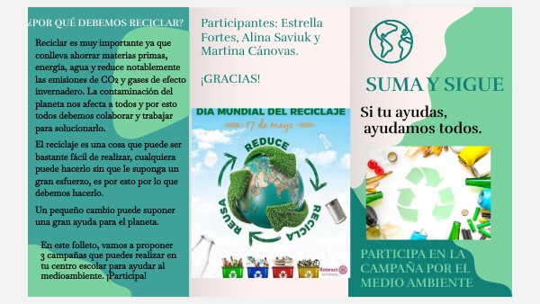 En este folleto, vamos a proponer 3 campañas que puedes realizar en tu centro escolar para ayudar al medioambiente. ¡Participa!