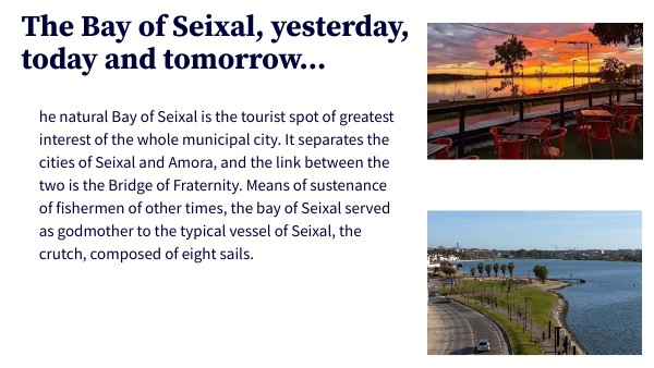he natural Bay of Seixal is the tourist spot of greatest interest of the whole municipal city. It separates the cities of Seixal and Amora, and the link between the two is the Bridge of Fraternity. Means of sustenance of fishermen of other times, the bay of Seixal served as godmother to the typical vessel of Seixal, the crutch, composed of eight sails.