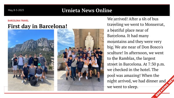 We arrived! After a 6h of bus traveling we went to Monserrat, a beatiful place near of Barcelona. It had many mountains and they were very big. We ate near of Don Bosco's sculture! In afternoon, we went to the Ramblas, the largest street in Barcelona. At 7:30 p.m. we checked in the hotel. The pool was amazing! When the night arrived, we had dinner and we went to sleep.
