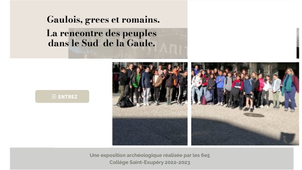 Bienvenue!Cette exposition montre des objets qui représentent des artefacts antiques que l'on aurait pu trouver sur des sites archéologiques. Ce projet a été réalisé par la classe de 6e5 du collège Saint-Exupéry de Bédarrides. La classe de 6e5 et toutes les classes de latin de Mme Boyer ont visité le site de Glanum et le musée de la Romanité à Nîmes. Fabriqués avec de l'argile, des colonnes en plastique, du polystirène, de la céramique et de la peinture, ils témoignent de la vie dans le Sud de la Gaule dans l'Antiquité. Les Gaulois, les Romains et les Grecs faisaient du commerce, mais ont aussi tissé des liens religieux et politiques.