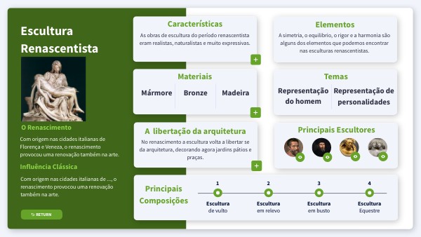 A simetria, o equilibrio, o rigor e a harmonia são alguns dos elementos que podemos encontrar nas esculturas renascentistas.