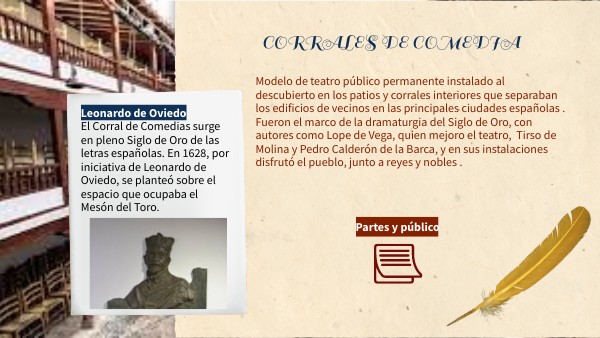 Modelo de teatro público permanente instalado al descubierto en los patios y corrales interiores que separaban los edificios de vecinos en las principales ciudades españolas . Fueron el marco de la dramaturgia del Siglo de Oro, con autores como Lope de Vega, quien mejoro el teatro, Tirso de Molina y Pedro Calderón de la Barca, y en sus instalaciones disfrutó el pueblo, junto a reyes y nobles .