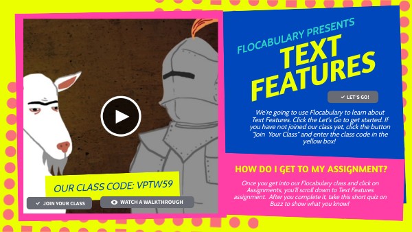 We're going to use Flocabulary to learn about Text Features. Click the Let's Go to get started. If you have not joined our class yet, click the button "Join Your Class" and enter the class code in the yellow box!