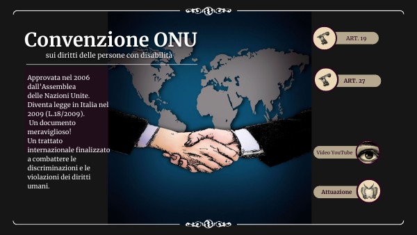 Approvata nel 2006 dall'Assemblea delle Nazioni Unite. Diventa legge in Italia nel 2009 (L.18/2009). Un documento meraviglioso! Un trattato internazionale finalizzato a combattere le discriminazioni e le violazioni dei diritti umani.