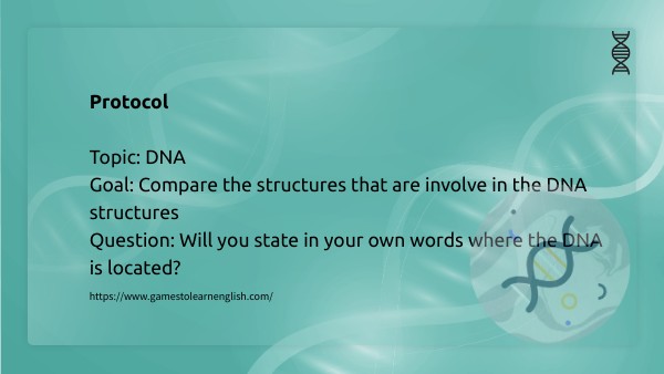 ProtocolTopic: DNA Goal: Compare the structures that are involve in the DNA structures Question: Will you state in your own words where the DNA is located?