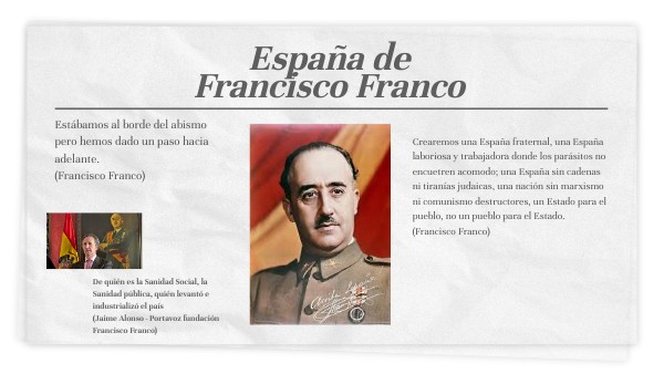 Crearemos una España fraternal, una España laboriosa y trabajadora donde los parásitos no encuetren acomodo; una España sin cadenas ni tiranías judaicas, una nación sin marxismo ni comunismo destructores, un Estado para el pueblo, no un pueblo para el Estado.(Francisco Franco)