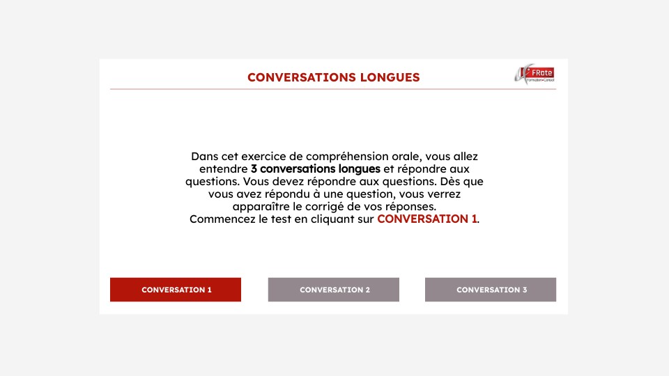 Dans cet exercice de compréhension orale, vous allez entendre 3 conversations longues et répondre aux questions. Vous devez répondre aux questions. Dès que vous avez répondu à une question, vous verrez apparaître le corrigé de vos réponses. Commencez le test en cliquant sur CONVERSATION 1.
