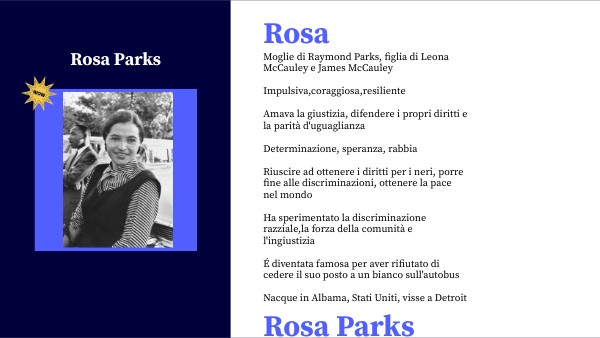 Moglie di Raymond Parks, figlia di Leona McCauley e James McCauleyImpulsiva,coraggiosa,resiliente Amava la giustizia, difendere i propri diritti e la parità d'uguaglianza Determinazione, speranza, rabbia Riuscire ad ottenere i diritti per i neri, porre fine alle discriminazioni, ottenere la pace nel mondo Ha sperimentato la discriminazione razziale,la forza della comunità e l'ingiustizia É diventata famosa per aver rifiutato di cedere il suo posto a un bianco sull'autobus Nacque in Albama, Stati Uniti, visse a Detroit