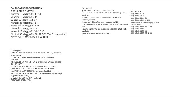 Ciao ragazzi, visto che domani sembra che la scuola sia chiusa, cambia il programma. Ecco il CALENDARIO AGGIORNATO DELLE PROSSIME ATTIVITA' MERCOLEDI' 17: ARITMETICA (2 interrogati: Antonia e Diego T.) + SCIENZE GIOVEDI' 18: Prof. Chioccini in gita con un'altra classe SABATO 20: VERIFICA DI ARITMETICA E GEOMETRIA MARTEDI' 23: ARITMETICA (interrogato Davide C.) MERCOLEDI' 24: VERIFICA FINALE DI MATEMATICA (su tutti gli argomenti dell'anno) GIOVEDI' 25: GEOMETRIA + SCIENZE SABATO 27: ARITMETICA