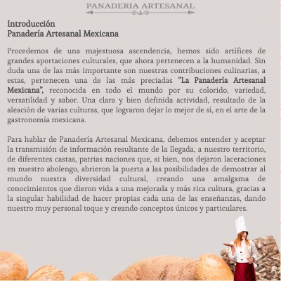 Para hablar de Panadería Artesanal Mexicana, debemos entender y aceptar la transmisión de información resultante de la llegada, a nuestro territorio, de diferentes castas, patrias naciones que, si bien, nos dejaron laceraciones en nuestro abolengo, abrieron la puerta a las posibilidades de demostrar al mundo nuestra diversidad cultural, creando una amalgama de conocimientos que dieron vida a una mejorada y más rica cultura, gracias a la singular habilidad de hacer propias cada una de las enseñanzas, dando nuestro muy personal toque y creando conceptos únicos y particulares.