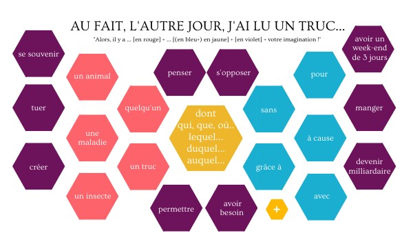 "Alors, il y a ... [en rouge] + ... [(en bleu+) en jaune] + [en violet] + votre imagination !"