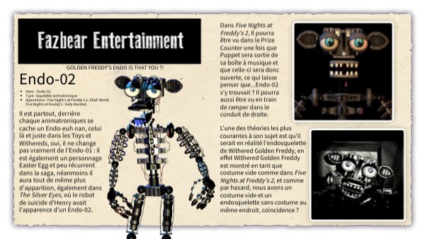 Il est partout, derrière chaque animatroniques se cache un Endo-euh nan, celui là et juste dans les Toys et Withereds, oui, il ne change pas vraiment de l'Endo-01 : il est également un personnage Easter Egg et peu récurrent dans la saga, néanmoins il aura tout de même plus d'apparition, également dans The Silver Eyes, où le robot de suicide d'Henry avait l'apparence d'un Endo-02.