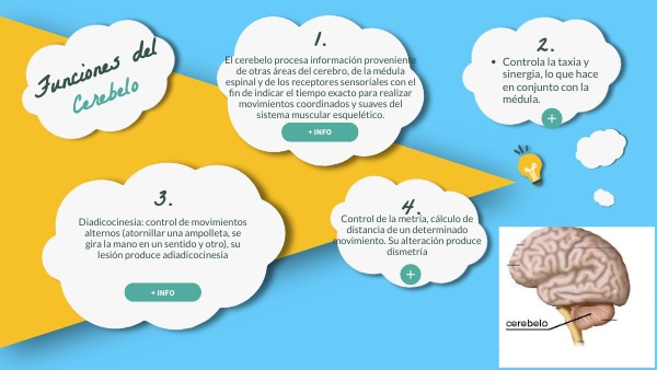 El cerebelo procesa información proveniente de otras áreas del cerebro, de la médula espinal y de los receptores sensoriales con el fin de indicar el tiempo exacto para realizar movimientos coordinados y suaves del sistema muscular esquelético.