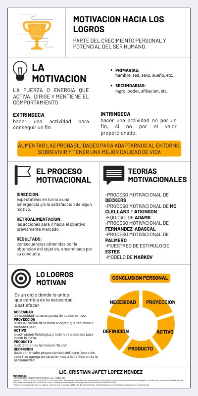 REFERENCIAS: - MOTIVACIÓN Y SENSOPERCEPCION (2.a ed.). (2023). IEU. - Ayala, S. (2018). LA PSICOLOGÍA DE LA MOTIVACIÓN | Asociación Mexicana de Psicoterapia y Educación. Asociación Mexicana De Psicoterapia Y Educación | Formación Profesional En Psicología, Psicoterapia Y Educación. https://www.psicoedu.org/la-psicologia-de-la-motivacion/?v=55f82ff37b55 - Proceso motivacional: qué es, etapas, y teorías que lo explican. (2021, 27 diciembre). https://psicologiaymente.com/psicologia/proceso-motivacional