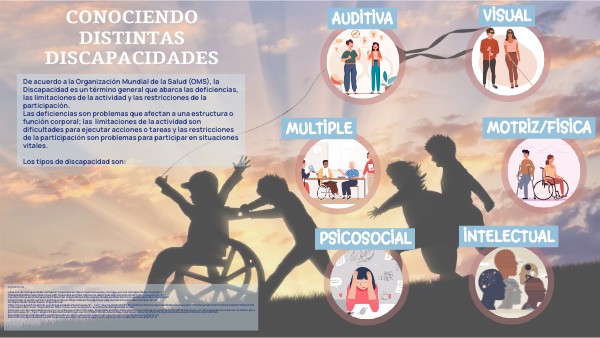De acuerdo a la Organización Mundial de la Salud (OMS), la Discapacidad es un término general que abarca las deficiencias, las limitaciones de la actividad y las restricciones de la participación. Las deficiencias son problemas que afectan a una estructura o función corporal; las limitaciones de la actividad son dificultades para ejecutar acciones o tareas y las restricciones de la participación son problemas para participar en situaciones vitales. Los tipos de discapacidad son: