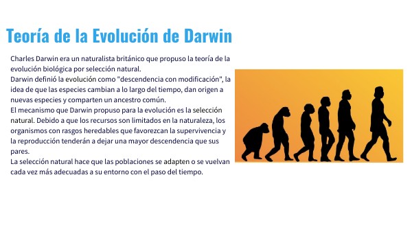Charles Darwin era un naturalista británico que propuso la teoría de la evolución biológica por selección natural. Darwin definió la evolución como "descendencia con modificación", la idea de que las especies cambian a lo largo del tiempo, dan origen a nuevas especies y comparten un ancestro común. El mecanismo que Darwin propuso para la evolución es la selección natural. Debido a que los recursos son limitados en la naturaleza, los organismos con rasgos heredables que favorezcan la supervivencia y la reproducción tenderán a dejar una mayor descendencia que sus pares. La selección natural hace que las poblaciones se adapten o se vuelvan cada vez más adecuadas a su entorno con el paso del tiempo.