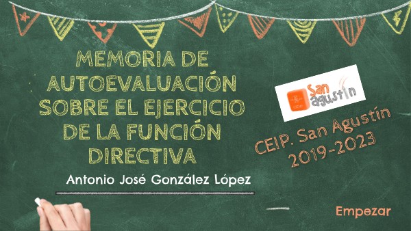 Dar a conocer todos los aspectos relacionados con el ejercicio de la función directiva efectivamente desarrollado, y que se ha llevado a cabo en el Ceip. San Agustín, durante el periodo que va de los cursos 2019/2020 a 2022/2023. Fruto de la reflexión de la dirección del centro, se reflejan los logros y dificultades relativas a las dimensiones básicas del ejercicio de la función directiva, así como las propuestas de mejora que se proponen para su inclusión en los Planes de Mejora del centro y que servirán de referencia para el inicio del posterior mandato. Es el resultado de un gran trabajo, colaboración y coordinación del equipo directivo, así como del trabajo realizado por el profesorado y demás personal del centro, y al apoyo del resto de la comunidad educativa. Se presentan los resultados del proceso de autoevaluación de estos cuatro años, considerando las actuaciones realizadas y relacionando las mismas con el Proyecto de dirección que se presentó para el período comprendido entre 2019 y 2023 y que han estado basadas en la experiencia previa y en la acumulada a lo largo de todo el mandato para intentar conseguir un estilo de dirección participativo, democrático, abierto al diálogo y con un uso de las relaciones como uno de los pilares fundamentales para ejercer el liderazgo pedagógico y organizativo. La mayor dificultad que se ha encontrado en la implementación del proyecto de dirección ha sido la crisis sanitaria, la situación de pandemia que ha tenido lugar durante la mayor parte del mandato, aunque la misma ha sido salvada con creces gracias al gran esfuerzo de toda la comunidad educativa.