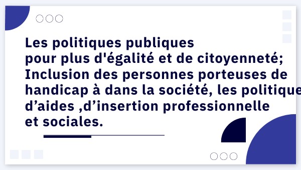 Les politiques publiques pour plus d'égalité et de citoyenneté; Inclusion des personnes porteuses de handicap à dans la société, les politiques d’aides ,d’insertion professionnelle et sociales.