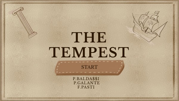 -The story begins whenProspero causes a tempest in the Mediterranean Sea, in which his brother Antonio and his fellow Alonso, king of Naples, are washed up on an unknown island and all the characters finally meet in Prospero's cavern. -Caliban, a monster, organises a rebellion against Prospero with Stephano and Trinculo, that fails.