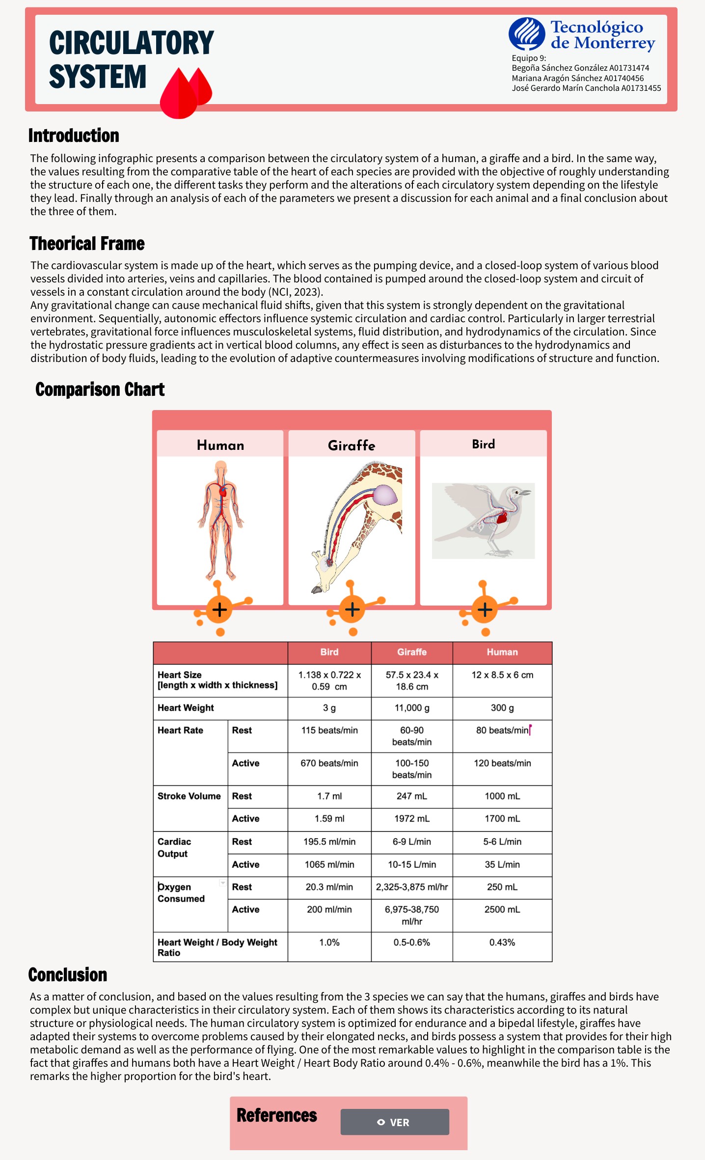 As a matter of conclusion, and based on the values resulting from the 3 species we can say that the humans, giraffes and birds have complex but unique characteristics in their circulatory system. Each of them shows its characteristics according to its natural structure or physiological needs. The human circulatory system is optimized for endurance and a bipedal lifestyle, giraffes have adapted their systems to overcome problems caused by their elongated necks, and birds possess a system that provides for their high metabolic demand as well as the performance of flying. One of the most remarkable values to highlight in the comparison table is the fact that giraffes and humans both have a Heart Weight / Heart Body Ratio around 0.4% - 0.6%, meanwhile the bird has a 1%. This remarks the higher proportion for the bird's heart.