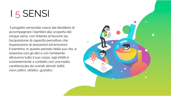 Il progetto sensoriale nasce dal desiderio di accompagnare i bambini alla scoperta dei cinque sensi, con l’intento di favorire sia l’acquisizione di capacità percettive che l’espressione di sensazioni ed emozioni. Il bambino, in questo periodo della sua vita, si relaziona con gli altri e con l’ambiente attraverso tutto il suo corpo, egli infatti è costantemente a contatto con una realtà caratterizzata da svariati stimoli: tattili, visivi,uditivi, olfattivi, gustativi.