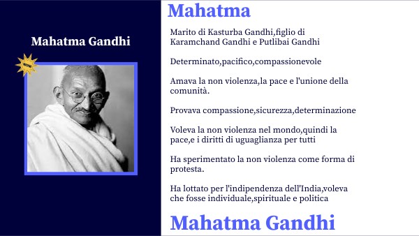 Marito di Kasturba Gandhi,figlio di Karamchand Gandhi e Putlibai Gandhi Determinato,pacifico,compassionevole Amava la non violenza,la pace e l'unione della comunità. Provava compassione,sicurezza,determinazione Voleva la non violenza nel mondo,quindi la pace,e i diritti di uguaglianza per tutti Ha sperimentato la non violenza come forma di protesta. Ha lottato per l'indipendenza dell'India,voleva che fosse individuale,spirituale e politica