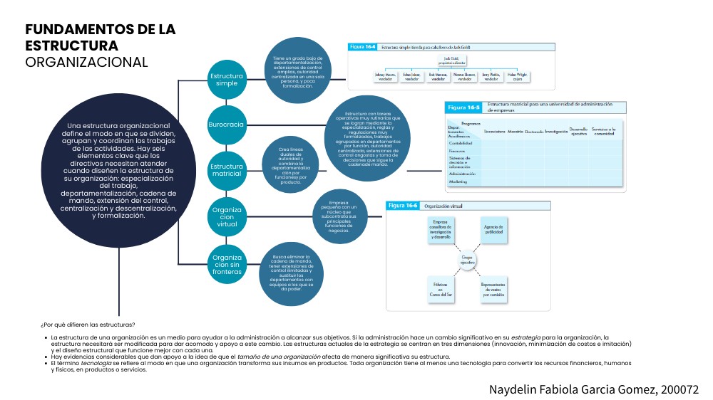 Una estructura organizacional define el modo en que se dividen, agrupan y coordinan los trabajos de las actividades. Hay seis elementos clave que los directivos necesitan atender cuando diseñen la estructura de su organización: especialización del trabajo, departamentalización, cadena de mando, extensión del control, centralización y descentralización, y formalización.