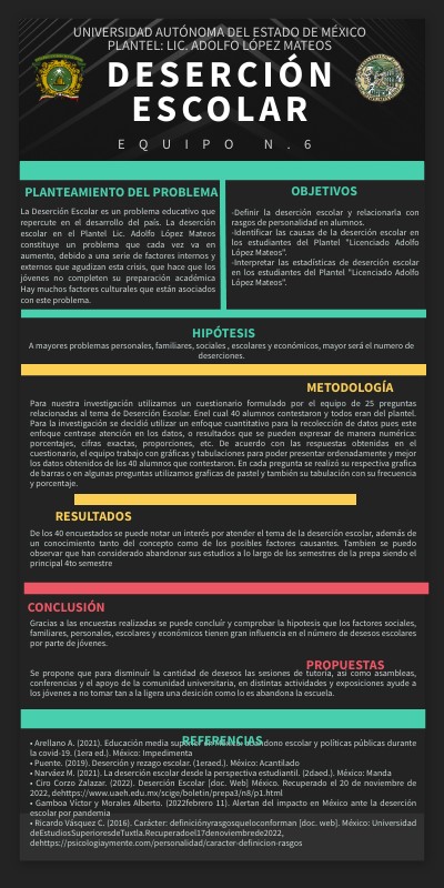 La Deserción Escolar es un problema educativo que repercute en el desarrollo del país. La deserción escolar en el Plantel Lic. Adolfo López Mateos constituye un problema que cada vez va en aumento, debido a una serie de factores internos y externos que agudizan esta crisis, que hace que los jóvenes no completen su preparación académica Hay muchos factores culturales que están asociados con este problema.