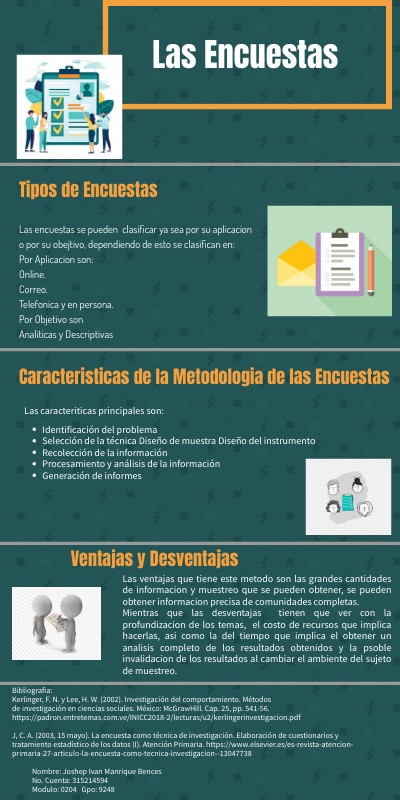 Bibliografia: Kerlinger, F. N. y Lee, H. W. (2002). Investigación del comportamiento. Métodos de investigación en ciencias sociales. México: McGrawHill. Cap. 25, pp. 541-56. https://padron.entretemas.com.ve/INICC2018-2/lecturas/u2/kerlingerinvestigacion.pdf J, C. A. (2003, 15 mayo). La encuesta como técnica de investigación. Elaboración de cuestionarios y tratamiento estadístico de los datos (I). Atención Primaria. https://www.elsevier.es/es-revista-atencion-primaria-27-articulo-la-encuesta-como-tecnica-investigacion--13047738 Nombre: Joshep Ivan Manrique Bences No. Cuenta: 315214594 Modulo: 0204 Gpo: 9248