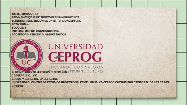 jueves 18/05/2023tema: enfoqeus de sistemas administrativos trabajo: realizacion de un mapa cionceptual actividad: 6 bloque: 3 materia: diceño orgnizaacional profesora: veronica jimenez ramos alumno: oberto jeremias shilon ruiz carrera: lic. lae grado y semestre: 2° semestre universidad: centro de estudios profesionales del grijalva ceprog campus san cristobal de las casas chiapas.