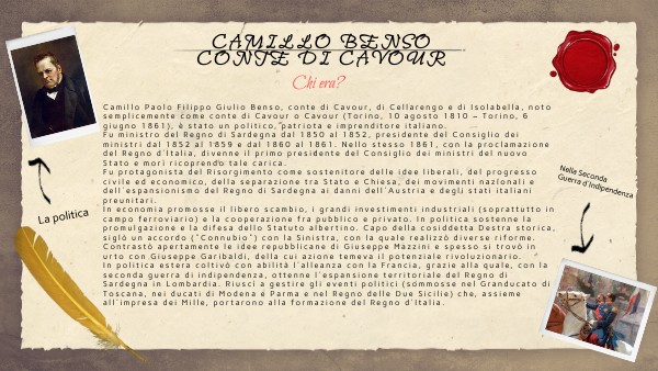 Camillo Paolo Filippo Giulio Benso, conte di Cavour, di Cellarengo e di Isolabella, noto semplicemente come conte di Cavour o Cavour (Torino, 10 agosto 1810 – Torino, 6 giugno 1861), è stato un politico, patriota e imprenditore italiano. Fu ministro del Regno di Sardegna dal 1850 al 1852, presidente del Consiglio dei ministri dal 1852 al 1859 e dal 1860 al 1861. Nello stesso 1861, con la proclamazione del Regno d'Italia, divenne il primo presidente del Consiglio dei ministri del nuovo Stato e morì ricoprendo tale carica. Fu protagonista del Risorgimento come sostenitore delle idee liberali, del progresso civile ed economico, della separazione tra Stato e Chiesa, dei movimenti nazionali e dell'espansionismo del Regno di Sardegna ai danni dell'Austria e degli stati italiani preunitari. In economia promosse il libero scambio, i grandi investimenti industriali (soprattutto in campo ferroviario) e la cooperazione fra pubblico e privato. In politica sostenne la promulgazione e la difesa dello Statuto albertino. Capo della cosiddetta Destra storica, siglò un accordo ("Connubio") con la Sinistra, con la quale realizzò diverse riforme. Contrastò apertamente le idee repubblicane di Giuseppe Mazzini e spesso si trovò in urto con Giuseppe Garibaldi, della cui azione temeva il potenziale rivoluzionario. In politica estera coltivò con abilità l'alleanza con la Francia, grazie alla quale, con la seconda guerra di indipendenza, ottenne l'espansione territoriale del Regno di Sardegna in Lombardia. Riuscì a gestire gli eventi politici (sommosse nel Granducato di Toscana, nei ducati di Modena e Parma e nel Regno delle Due Sicilie) che, assieme all'impresa dei Mille, portarono alla formazione del Regno d'Italia.