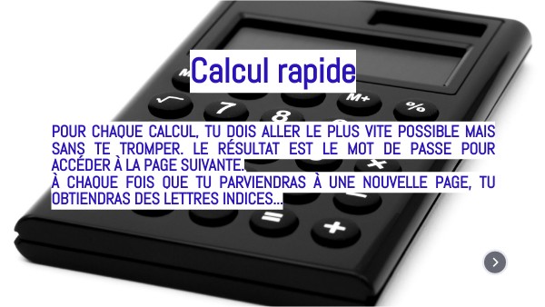 Pour chaque calcul, tu dois aller le plus vite possible mais sans te tromper. Le rÉsultat est le mot de passe pour accÉder À la page suivante. À chaque fois que tu parviendras à une nouvelle page, tu obtiendras des lettres indices...