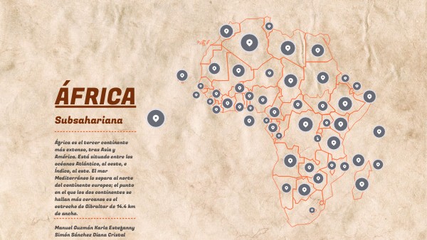 África es el tercer continente más extenso, tras Asia y América. Está situado entre los océanos Atlántico, al oeste, e Índico, al este. El mar Mediterráneo lo separa al norte del continente europeo; el punto en el que los dos continentes se hallan más cercanos es el estrecho de Gibraltar de 14.4 km de ancho. Manuel Guzmán Karla Estefanny Simón Sánchez Diana Cristal