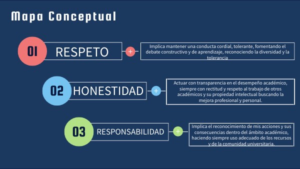 Actuar con transparencia en el desempeño académico, siempre con rectitud y respeto al trabajo de otros académicos y su propiedad intelectual buscando la mejora profesional y personal.