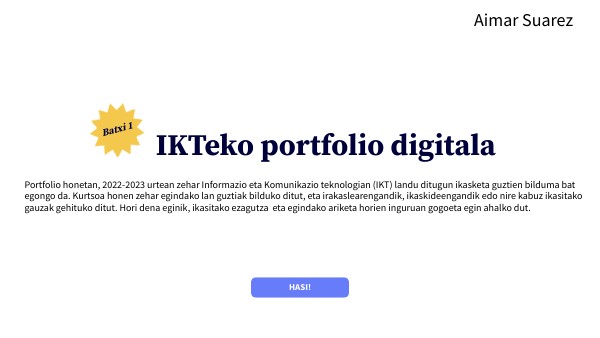 Portfolio honetan, 2022-2023 urtean zehar Informazio eta Komunikazio teknologian (IKT) landu ditugun ikasketa guztien bilduma bat egongo da. Kurtsoa honen zehar egindako lan guztiak bilduko ditut, eta irakaslearengandik, ikaskideengandik edo nire kabuz ikasitako gauzak gehituko ditut. Hori dena eginik, ikasitako ezagutza eta egindako ariketa horien inguruan gogoeta egin ahalko dut.