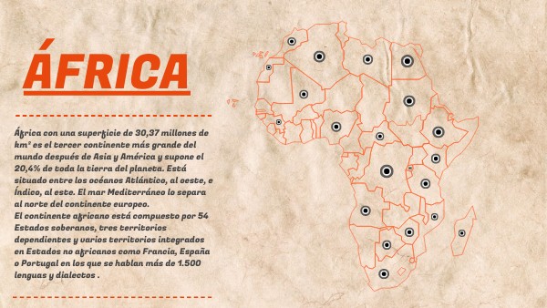 África con una superficie de 30,37 millones de km² es el tercer continente más grande del mundo después de Asia y América y supone el 20,4% de toda la tierra del planeta. Está situado entre los océanos Atlántico, al oeste, e Índico, al este. El mar Mediterráneo lo separa al norte del continente europeo. El continente africano está compuesto por 54 Estados soberanos, tres territorios dependientes y varios territorios integrados en Estados no africanos como Francia, España o Portugal en los que se hablan más de 1.500 lenguas y dialectos .