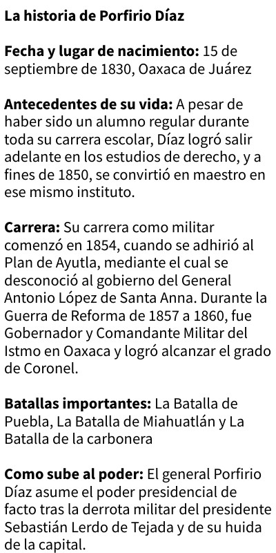 La historia de Porfirio Díaz Fecha y lugar de nacimiento: 15 de septiembre de 1830, Oaxaca de Juárez Antecedentes de su vida: A pesar de haber sido un alumno regular durante toda su carrera escolar, Díaz logró salir adelante en los estudios de derecho, y a fines de 1850, se convirtió en maestro en ese mismo instituto. Carrera: Su carrera como militar comenzó en 1854, cuando se adhirió al Plan de Ayutla, mediante el cual se desconoció al gobierno del General Antonio López de Santa Anna. Durante la Guerra de Reforma de 1857 a 1860, fue Gobernador y Comandante Militar del Istmo en Oaxaca y logró alcanzar el grado de Coronel. Batallas importantes: La Batalla de Puebla, La Batalla de Miahuatlán y La Batalla de la carbonera Como sube al poder: El general Porfirio Díaz asume el poder presidencial de facto tras la derrota militar del presidente Sebastián Lerdo de Tejada y de su huida de la capital.
