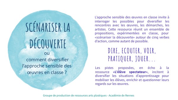 Cette ressource élaborée par le groupe de production de ressources en arts plastiques de l’académie de Rennes, s’insère dans un ensemble de réflexion portant sur les composantes culturelles et des modalités possibles de rencontre avec les œuvres. Dans la continuité de la ressource, « l’élève spectateur », elle engage la réflexion sur la construction de scénarios pédagogiques, expérimentés en classe, afin de proposer une découverte possible des œuvres par un ensemble d'expériences sensibles, sensorielles et ludiques. Les dispositifs, conçus en lien avec les compétences disciplinaires, s'intégre dans l'ensemble cohérent d'une séquence développant les composantes plasticiennes, théoriques et culturelles et élaboré comme une unité d'enseignement. Elles ont pour objectifs de permettre à l’élève de découvrir et mémoriser de façon durable les œuvres rencontrées et ainsi se constituer un champ de références personnel et partagé.