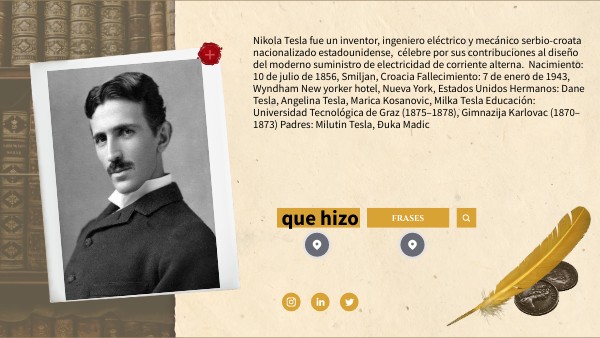 Nikola Tesla fue un inventor, ingeniero eléctrico y mecánico serbio-croata nacionalizado estadounidense, célebre por sus contribuciones al diseño del moderno suministro de electricidad de corriente alterna. Nacimiento: 10 de julio de 1856, Smiljan, Croacia Fallecimiento: 7 de enero de 1943, Wyndham New yorker hotel, Nueva York, Estados Unidos Hermanos: Dane Tesla, Angelina Tesla, Marica Kosanovic, Milka Tesla Educación: Universidad Tecnológica de Graz (1875–1878), Gimnazija Karlovac (1870–1873) Padres: Milutin Tesla, Đuka Madic