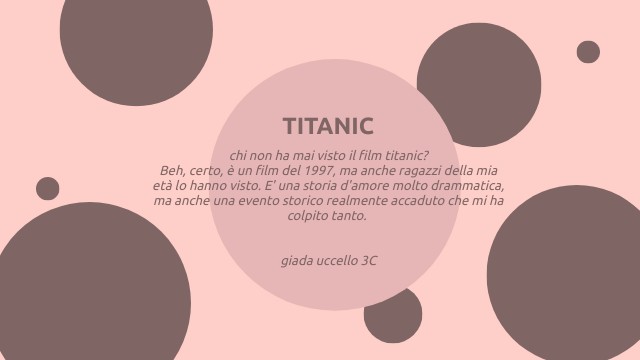 chi non ha mai visto il film titanic? Beh, certo, è un film del 1997, ma anche ragazzi della mia età lo hanno visto. E' una storia d'amore molto drammatica, ma anche una evento storico realmente accaduto che mi ha colpito tanto. giada uccello 3C