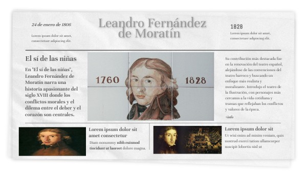 Destaca por la habilidad de crear diálogos ingeniosos y situaciones cómicas, abordando temas sociales y morales, como las costumbres de la sociedad que frenaban el progreso. Sus personajes realistas y complejos generaron reflexiones sobre la libertad y la sinceridad en las relaciones humanas. Moratín también fue un promotor de reformas en el teatro español, buscando un enfoque más realista. Todo esto se puede ver en sus obras más reconocidas “el sí de las niñas” y "la comedia nueva o el café"